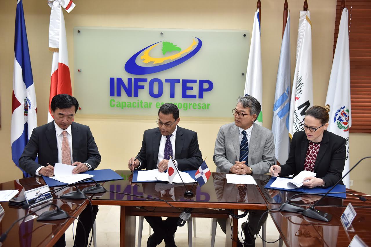 El documento fue suscrito por el director general del INFOTEP, Rafael Ovalles; el Representante Residente de la JICA en República Dominicana, Akihiko Yamada y María Fernanda Ortega, directora de Cooperación Bilateral del Ministerio de Economía, Planificación y Desarrollo.