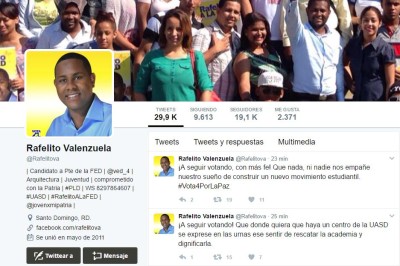 SANTO DOMINGO. El candidato a presidente para la Federación de Estudiantes Dominicanos (FED) por el movimiento Vanguardia Estudianil, Rafelito Valenzuela, tuiteó un mensaje en el que llama “a seguir votando con mas fe” luego del tiroteo que dejó al menos un muerto y unas seis personas heridas.