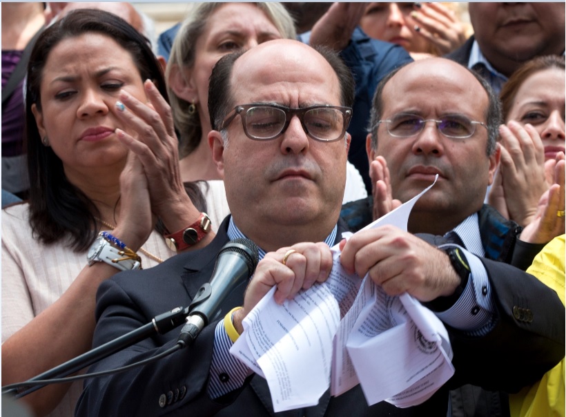 El TSJ mantenía en desacato a la Asamblea Nacional (AN, Parlamento) desde principios de 2016 luego de que la directiva de la Cámara decidiera juramentar a tres legisladores opositores indígenas cuya elección había sido suspendida por un supuesto fraude electoral. La decisión de los opositores de investir a estos tres diputados pese a una prohibición expresa de la máxima corte fue la primera fisura entre los poderes públicos que alcanzó hoy el clímax de la crisis institucional.