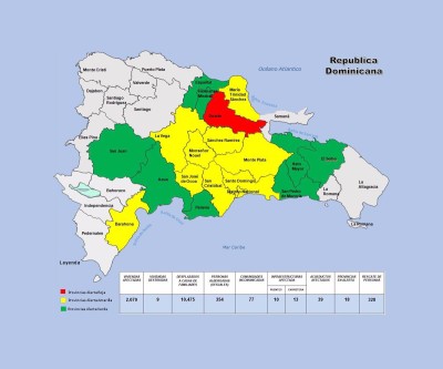 En alerta roja están las provincias: Duarte (en especial Bajo Yuna), en alerta amarilla: Barahona, Monte Plata, Monseñor Nouel, La Vega, San José de Ocoa, María Trinidad Sánchez, Sánchez Ramírez, San Cristóbal (en especial Villa Altagracia) y el Gran Santo Domingo. En verde: Hato Mayor, San Juan de la Maguana, El Seibo, Espaillat, Hermanas Mirabal, Azua, San Pedro Macorís y Peravia.