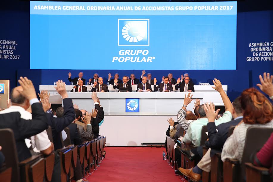 Santo Domingo, DN.- El Grupo Popular celebró el pasado sábado 29 de abril su Asamblea General Ordinaria Anual de Accionistas, en la cual el señor Manuel A. Grullón, presidente de esta organización financiera, dio a conocer ante los asambleístas el sano crecimiento de los principales indicadores financieros de esta casa matriz y sus empresas filiales, destacando entre ellos el aumento de los activos productivos con adecuados niveles de liquidez, eficiencia y solvencia.