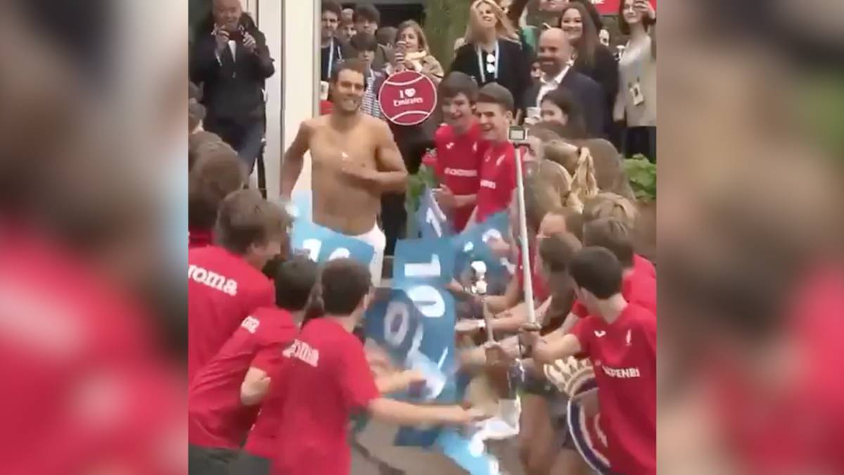 Nadal cumplió con la tradición de tirarse a la piscina, pero esta vez el pantalón estuvo a punto de jugarle una mala pasada.