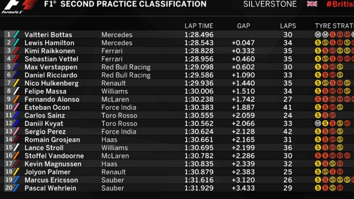 La jornada del viernes en Silverstone volvió a tener a los dos Mercedes copando las dos posiciones de privilegio en un buen día para Fernando Alonso que acabó noveno. Vettel fue sexto y Carlos Sainz, undécimo.