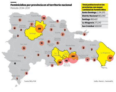 Diario Libre analizó el tema prestando atención a las zonas geográficas y el nivel socioeconómico y educativo de los agresores. Para ello, tomó el período entre 2014 hasta marzo de este año y se encontró que Santo Domingo (60), Santiago (39), La Altagracia (22), San Cristóbal (20) y el Distrito Nacional (18), son las cinco localidades donde con mayor frecuencia ocurren los casos de feminicidios.