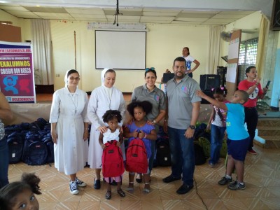 SANTO DOMINGO. Exalumnos del Colegio Don Bosco donaron mochilas equipadas con todos los útiles escolares a Canillitas con Laura Vicuña, obra de las hermanas Salesianas que alberga unas 400 niñas de escasos recursos económicos.