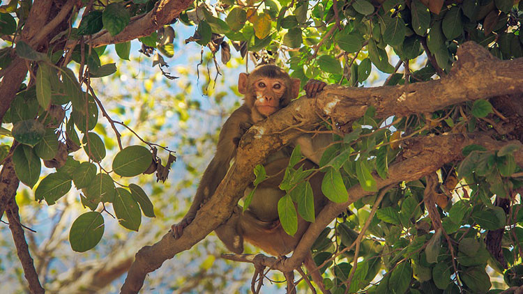 Esta especie de mono presenta patas de color dorado, un abundante pelaje en la cabeza y se mueve como un gato porque utiliza las cuatro patas para desplazarse por las ramas.