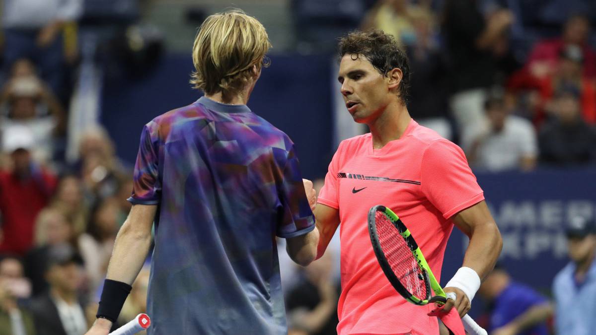 Rafael Nadal estará, por 26ª vez, en semifinales de un Grand Slam. Esta vez el sometido fue Rublev (6-1, 6-2, 6-2) en un partido que Nadal dominó desde el servicio y su derecha. Precisamente de lo primero habló al final del encuentro: «En cuanto a la coordinación de mis primeros tengo que mejorar. No me importan tanto los porcentajes como mis sensaciones. Gano puntos con ellos. Aunque en el tercero he bajado un poco, pero he cambiado la dirección de mi servicio con éxito y para mi eso es importante». Respecto a Rublev, al que le costó mucho devolver los golpes hasta el punto de que firmó 43 errores no forzados, dijo: «Ahora el tenis va muy rápido y es más difícil colocarse de derechas con el resto. Es importante cubrirse para pegar con la derecha. Yo cubro mucha pista con ella. Si no puedo pegar con ella también estoy cómodo con el revés».