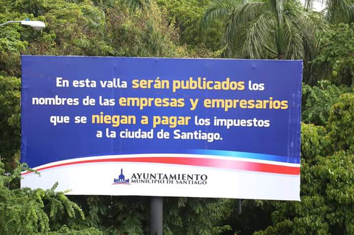 SANTIAGO. El Ayuntamiento de Santiago colocó una valla publicitaria en la intersección que forman las avenidas Salvador Estrella Sadhalá y Juan Pablo Duarte, de esta ciudad, en la que advierte a los empresarios que publicarán sus nombres en ese espacio si no pagan los arbitrios municipales.