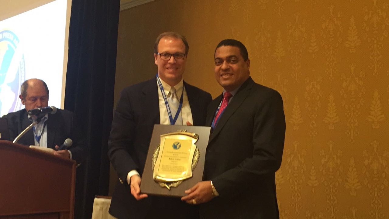 José Monegro, director de El Día, su sucesor en la dirección ejecutiva de ese diario, recibió la placa de reconocimiento que la SIP le entregó.