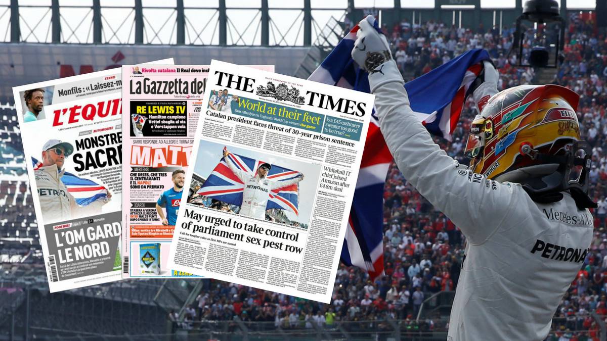 Un cuarto título de la máxima competición del automovilismo es algo extraordinario, algo que solo han alcanzado cinco pilotos en la historia y que te asegura una plaza entre los deportistas más recordados de siempre. Lewis Hamilton ya es uno de ellos tras sufrir más de lo esperado en México, su éxito merece resonar por todo el planeta y así lo ha hecho en los principales medios del mundo. La imagen del piloto de Mercedes con la bandera británica es protagonista de portadas y lugares destacados. Demos un repaso por la prensa internacional.