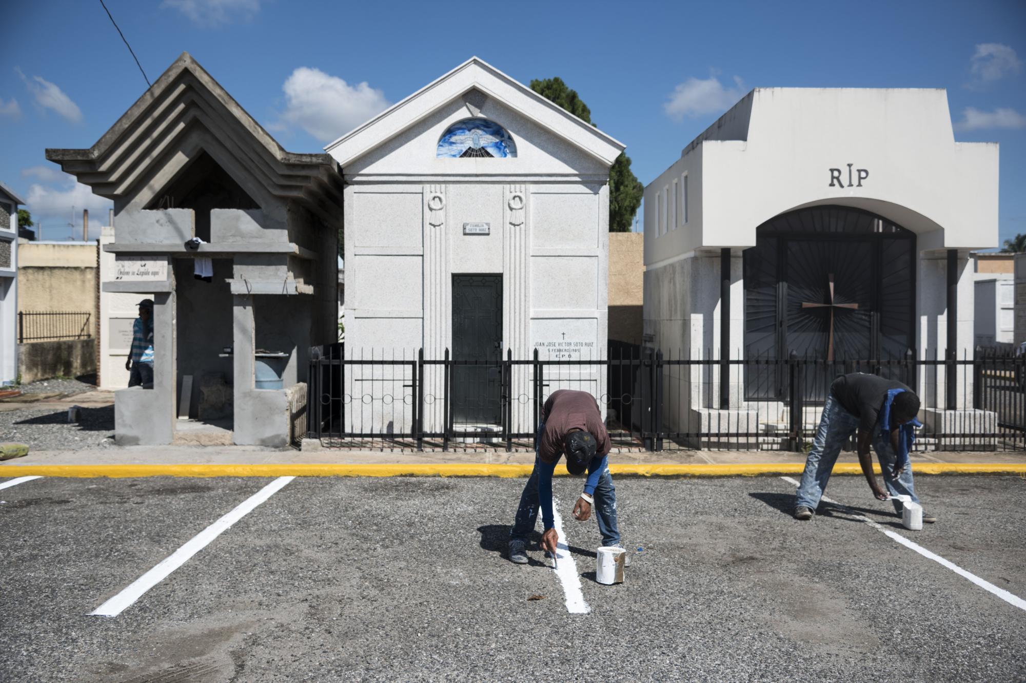 Empleados del Ayuntamiento del Distrito Nacional (ADN), ultimaban detalles a la pintura en los parqueos, recogida de escombros, aseo de calles internas y desyerbe en el Cementerio Nacional de la Máximo Gómez.