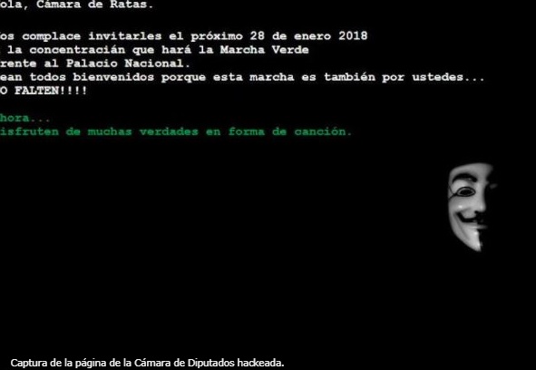 SANTO DOMINGO. El cibersitio de la Cámara de Diputados de República Dominicana fue hackeado la madrugada de este martes, confirmó ese hemiciclo después que en las redes sociales se difundiera la información y en la que se muestran dos imágenes de la página invadida, una de un joven con un afro y con un suéter verde, y otra con la careta de Guy Fawkes, utilizada por Anonymous, ambas invitando a la próxima concentración de la Marcha Verde.