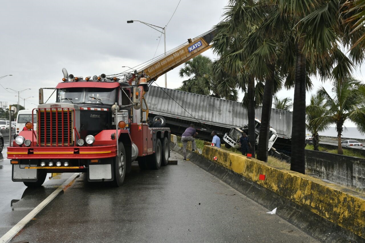 SANTO DOMINGO. Una enorme grúa intenta levantar la patana de doble remolque perteneciente a la empresa César Iglesias, accidentada pasadas las cuatro de la madrugada de hoy, y el trabajo ha ocasionado un tapón que se extiende por cuatro kilómetros en dirección oeste-este.