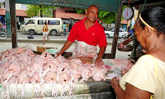“Trabajamos con estadísticas y podemos decir que la demanda ha subido entre el 15 y el 20%. Pero realmente el pollo no ha subido ni debe subir, porque estamos respondiendo a esa demanda. Mantenemos la libra en 30 pesos en granja”, aseguró Ambiórix Cabrera, representante de la empresa Unipollo y miembro de la Asociación de Pequeños Productores Avícolas de Moca. “Si Unipollo no es la empresa productora de pollo más grande del país, es la segunda, lo que indica que tenemos aval para referirnos al tema. Y yo te digo que no hay problema con el pollo”, indicó Cabrera, quien también produce cerdos. “En cerdo andamos bien. Aparecen unos cuantos por ahí que hacen sus cosas con el pollo. Eso ocurre. Nosotros, como empresa, procesamos entre 40 y 50 mil pollos diarios, sin problema y abastecemos los clientes”, expuso. Calculó que “este pueblo necesita 490 mil pollos diariamente y estas granjas están hasta el tope, como dicen los viejos”, apuntó. Según Cabrera, “hay algunos productores pequeños que empiezan a especular con la carne, argumentando que hay escasez, sin que sea real”.