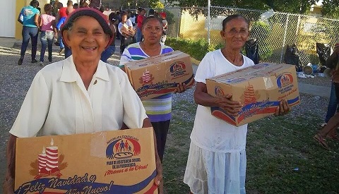 Los productos contenidos en las cajas son arroz, habichuelas, ponche, harina, pasta, azúcar, vino, ron, sardinas, sazones, café y cazabe, entre otros.