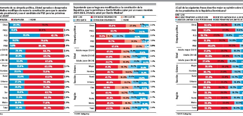 Entre quienes se inclinan por el PLD las opiniones están divididas, pues un 55% aprueba una reforma a la Constitución para que Medina sea el candidato presidencial, y un 42% desaprueba esa posibilidad.