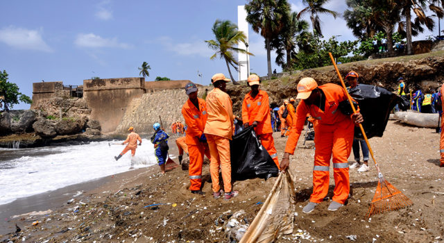 El Ministerio de Obras Públicas y Comunicaciones (MOPC) y el Ayuntamiento del Distrito Nacional (ADN), retiraron ayer más de 300 fundas de desechos sólidos (15 toneladas) en su mayoría plásticos que se aglutinaron en la playa del Fuerte San Gil en el Malecón de Santo Domingo.