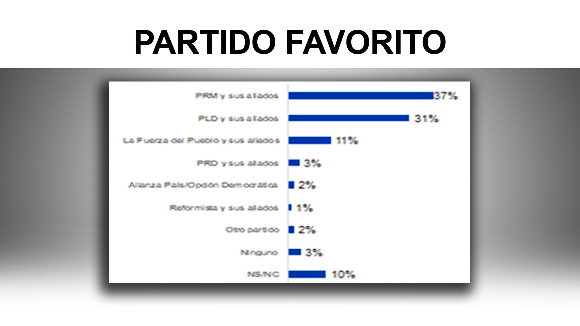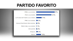 Cuando se pregunta por el candidato presidencial pero para que indique el partido, un 37% señaló al PRM, un 31% al PLD y un 11% a La Fuerza del Pueblo. Un 10% está indeciso, lo que es alto a cuatro meses de las elecciones, tal vez influenciados por la división del PLD y las alianzas entre partidos.