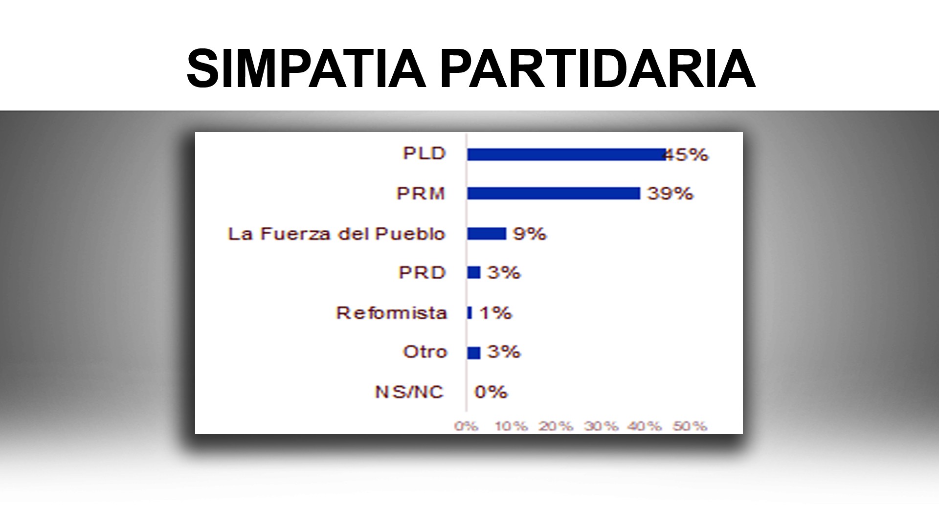 Entre los que simpatizan por un partido un 45% señala al PLD; un 39% al PRM; un 9% a La Fuerza del Pueblo; un 3% al PRD y un 1% al Reformismo. La simpatía por el PLD excede el voto a favor de Gonzalo Castillo (28%), mientras que Abinader saca 43% mientras que la simpatía por su partido es solo un 39%.