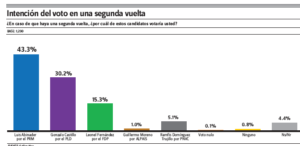 En ese sentido, el 58% de los que tienen preferencias por la FP creen que nadie ganará en primera vuelta, y lo mismo piensa el 48% de los que simpatizan por el PRSC.