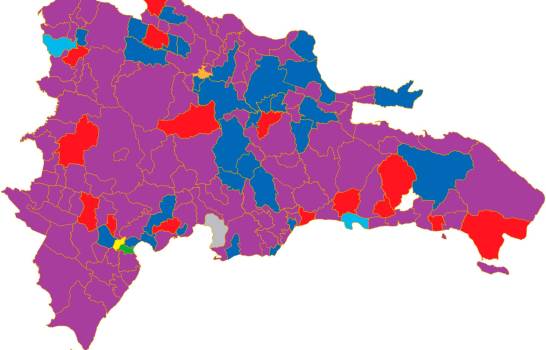 Con tantas alcaldías, el mapa dominicano de los municipios se tiño de morado, según el boletín final de los resultados emitido por la Junta Central Electoral.