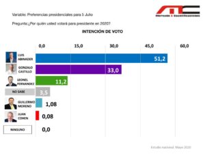 La investigación en línea realizada durante los días del 21 al 25 de mayo del 2020, utilizó 3,532 participantes mayores de 18 años, hábiles para votar en las próximas elecciones presidenciales del 5 de julio; además, tuvo un diseño de muestra probabilística aleatoria que le permite tener un nivel de confianza de un 95 por ciento, y un margen de error de un 1.6 por ciento.