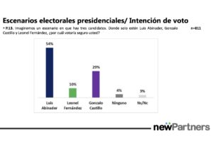 El candidato presidencial Luis Abinader cuenta con la intención de “voto seguro” del 54% del electorado, frente a 29 de Gonzalo, 10 de Leonel Fernández, mientras sólo un 4% afirma que no votaría por ninguno, y un 3% no sabe, no conoce.