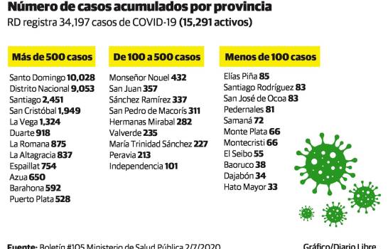 De los 34,197 casos positivos a COVID-19 confirmados, 24,805 casos están concentrados en cuatro provincias y el Distrito Nacional, lo que representa un 72.5% del total, de acuerdo a las cifras ofrecidas por el Ministerio de Salud Pública en el últmo boletín.