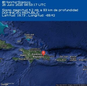 El movimiento se localizó en las coordenadas 18.725 ° N 69.422 ° O, a 14.8 kilómetros al Oeste de Hato Mayor, con epicentro a unos 89.4. 3 kms de profundidad.