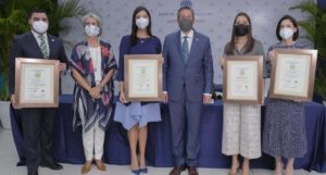 El ministro de Medio Ambiente, Orlando Jorge Mera, y Ginny Heinsen, presidenta de Sostenibilidad 3R’s, entregaron los certificados a Fraysis Moronta; directora general senior de Capital Humano, Procesos, Tecnología y Operaciones; July Mejía Capell, directora general de Capital Humano; Sabrina Andújar, directora del Voluntariado Banreservas, y Jesús González García, gerente de Salud y Seguridad Ocupacional.
