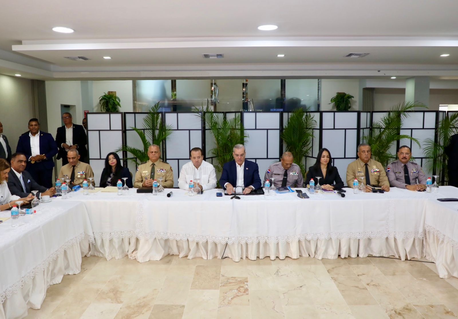 En compañía del mandatario, se encuentran los ministros; de la Presidencia, José Ignacio Paliza; de Interior y Policía, Faride Raful; de Defensa, teniente general Carlos Antonio Fernández Onofre; la procuradora General de la República, Yeni Berenice Reynoso; el director de la Policía Nacional, mayor general Ramón Antonio Guzmán Peralta