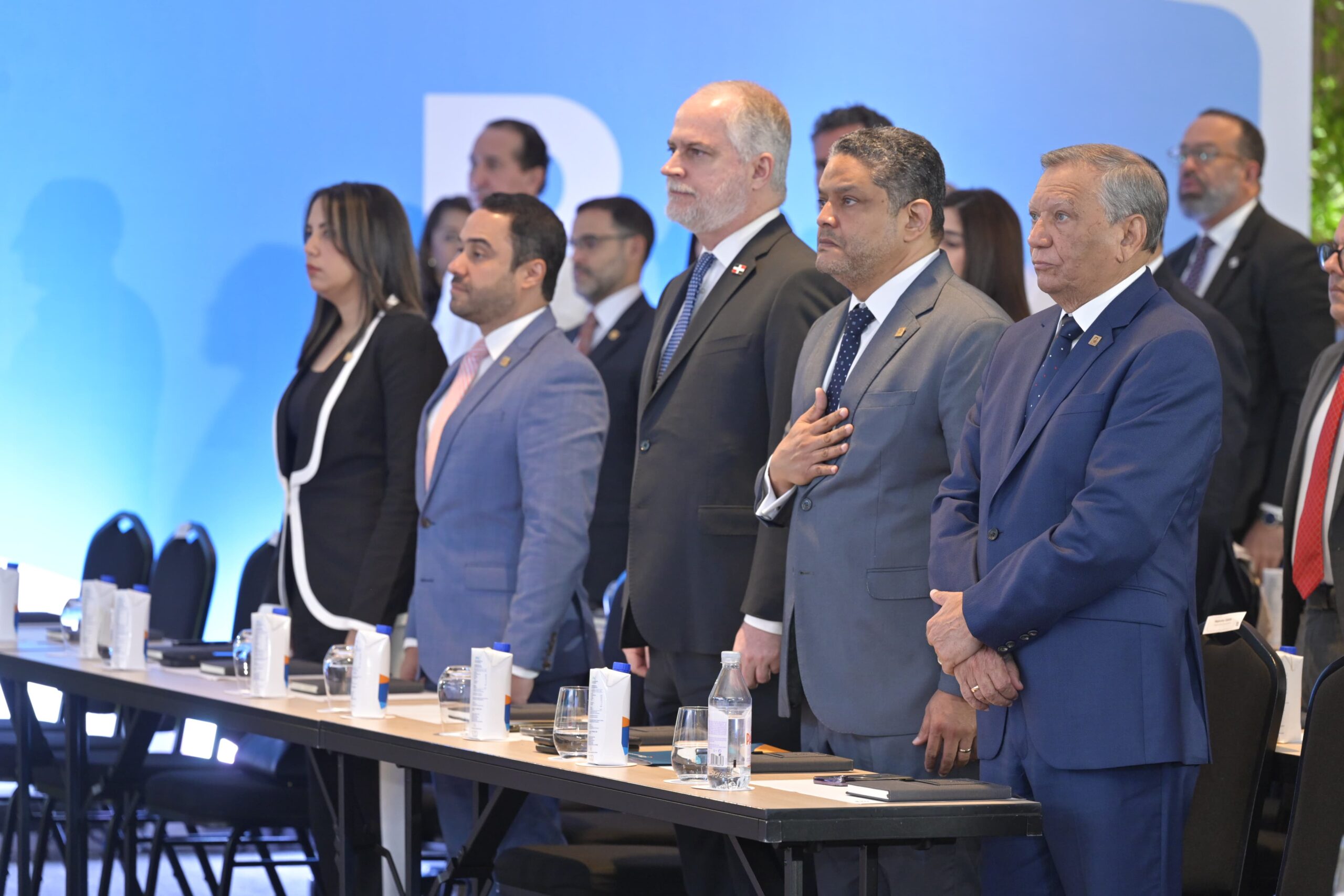 1. El presidente ejecutivo de Banreservas, doctor Leonardo Aguilera, en la apertura del Tercer Congreso Contra el Lavado de Activos y el Financiamiento del Terrorismo, acompañado, desde la izquierda, por el coronel (ERD) Jaime Pérez Díaz, director de Investigaciones Financieras de la Dirección Nacional de Control de Drogas; magistrado Wilson Manuel Camacho, director general de Persecución del Ministerio Público; Alejandro Fernández W., superintendente de Bancos; Heiromy Casto, vicepresidente de Cumplimiento de Banreservas; y Bienvenido Roberts Carrero, director técnico de la Unidad de Análisis Financiero(UAF).