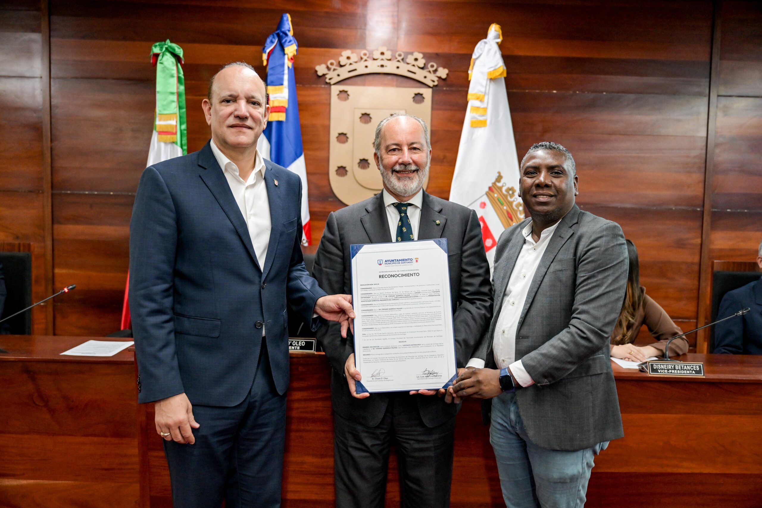 Santiago de los Caballeros.– El Concejo de Regidores del Ayuntamiento de Santiago de los Caballeros reconoció este viernes como Visitante Distinguido de la ciudad al excelentísimo Stefano Queirolo Palmas, embajador de Italia en la República Dominicana, mediante la resolución número 3419-25, en mérito a su destacada trayectoria diplomática y a su contribución al fortalecimiento de las relaciones bilaterales entre ambos países.