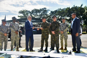 Allí se exhibieron tres vehículos blindados FURIA (Fuerza Unificada de Respuesta Inmediata Armada), ensamblados en la industria militar dominicana, así como un vehículo aéreo no tripulado militar. Ambos se usarán para resguardar la frontera, informaron las autoridades.