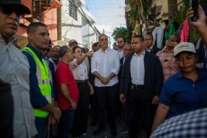 *Santo Domingo.–* El presidente Luis Abinader continuó este martes sus recorridos de supervisión por las comunidades afectadas por las intensas precipitaciones de las últimas semanas, acudiendo en esta ocasión al barrio Los Platanitos, próximo a la Avenida Winston Churchill del Distrito Nacional, donde viven más de 200 familias y dedicó tiempo para escuchar personalmente a sus residentes y coordinar, junto con la alcaldesa Carolina Mejía, una intervención del Gobierno oportuna y definitiva.