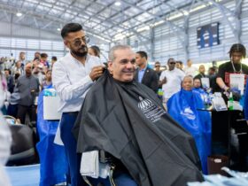 Presidente Abinader sostiene encuentro nacional con 1,000 peluqueros y recibe recorte de cabello durante jornada social*