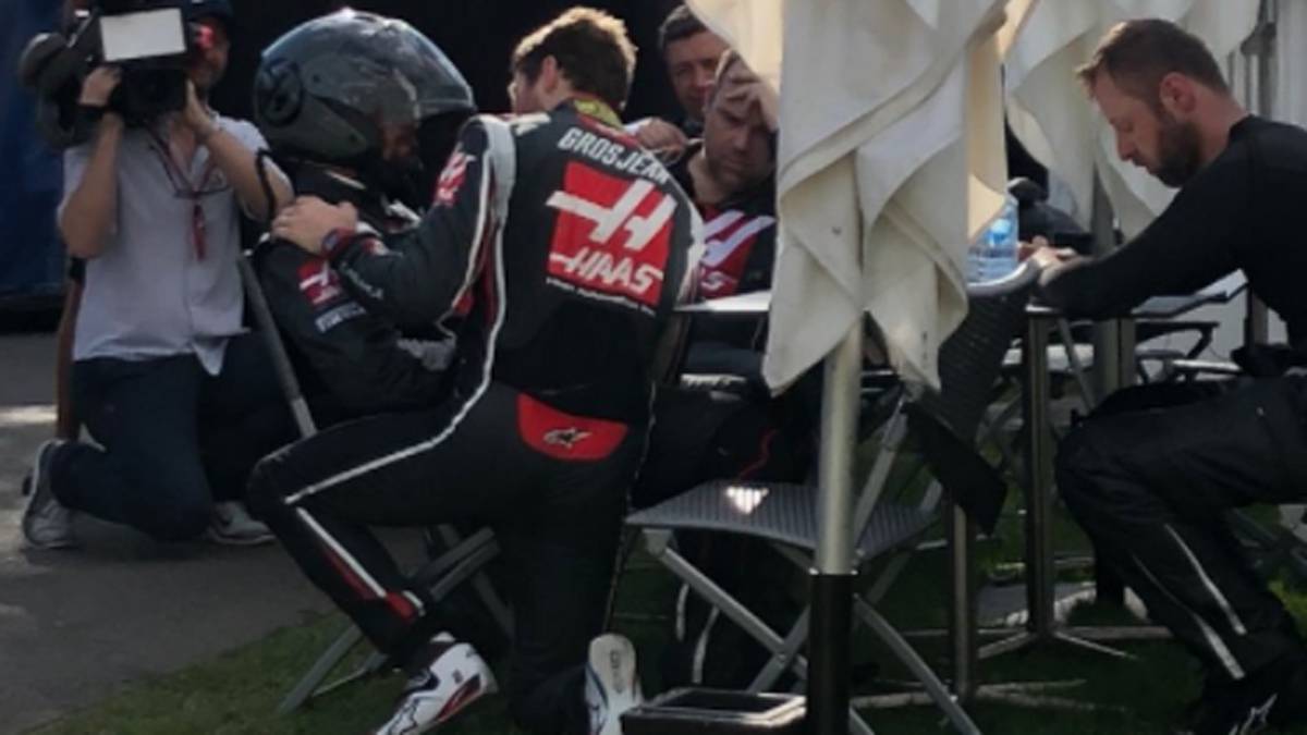 Emotivo gesto de Grosjean con su mecánico tras fallar en el pitstop